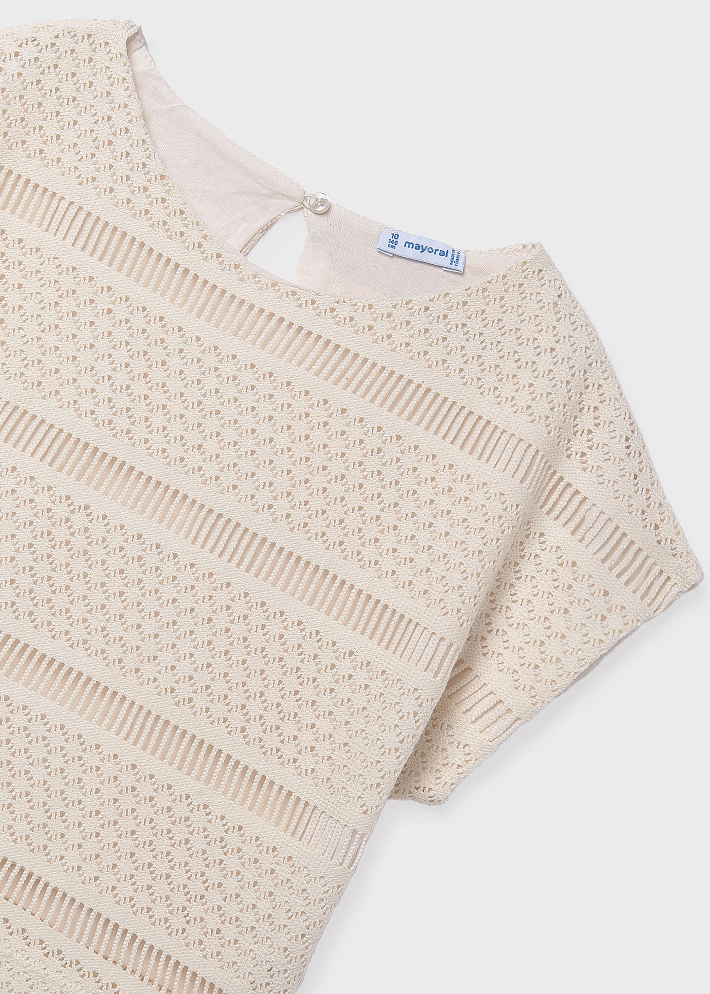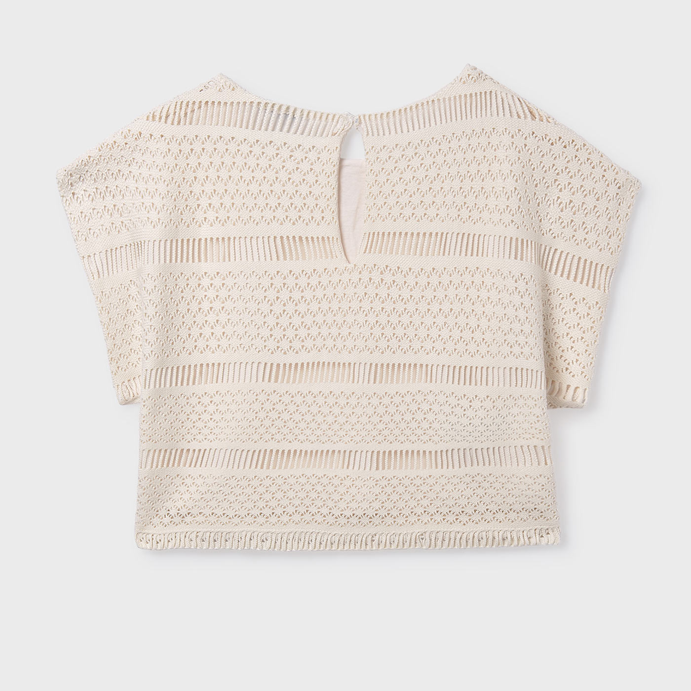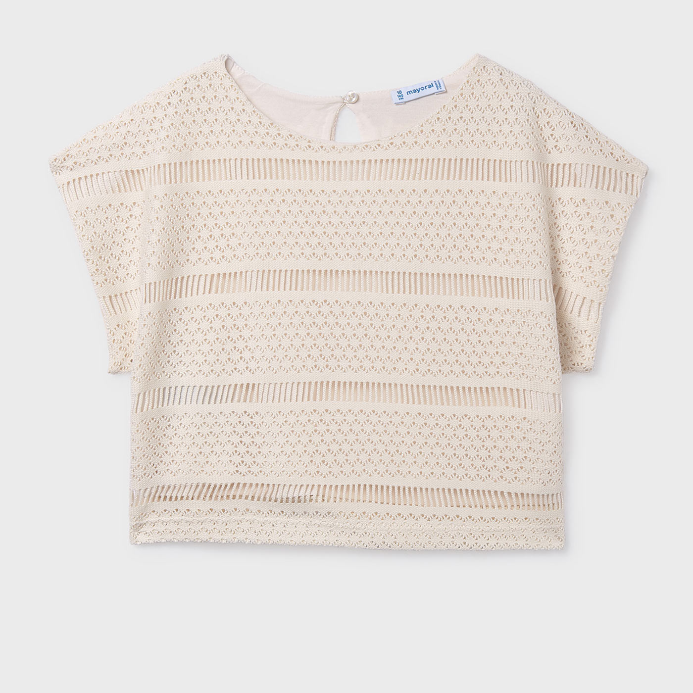 Φρέσκο, κομψό και απόλυτα καλοκαιρινό, αυτό το παιδικό crochet τοπ Mayoral σε διαχρονική μπεζ απόχρωση είναι ιδανικό για ανάλαφρες και στυλάτες εμφανίσεις. Το πλεκτό crochet σχέδιο με διάτρητη υφή προσφέρει δροσερή αίσθηση και ξεχωριστό χαρακτήρα, ιδανικό για τις ζεστές ημέρες.Διαθέτει άνετη γραμμή και κοντό μήκος, ενώ τα μανίκια τύπου κιμονό χαρίζουν μοντέρνο και χαλαρό στυλ. Το κλείσιμο με κουμπί στο πίσω μέρος διευκολύνει το ντύσιμο, ενώ οι ανάγλυφες πλεκτές ρίγες προσθέτουν κομψή λεπτομέρεια. Συνδυάζεται εύκολα με φούστες, σορτς ή παντελόνια, δημιουργώντας ολοκληρωμένα καλοκαιρινά σύνολα.
