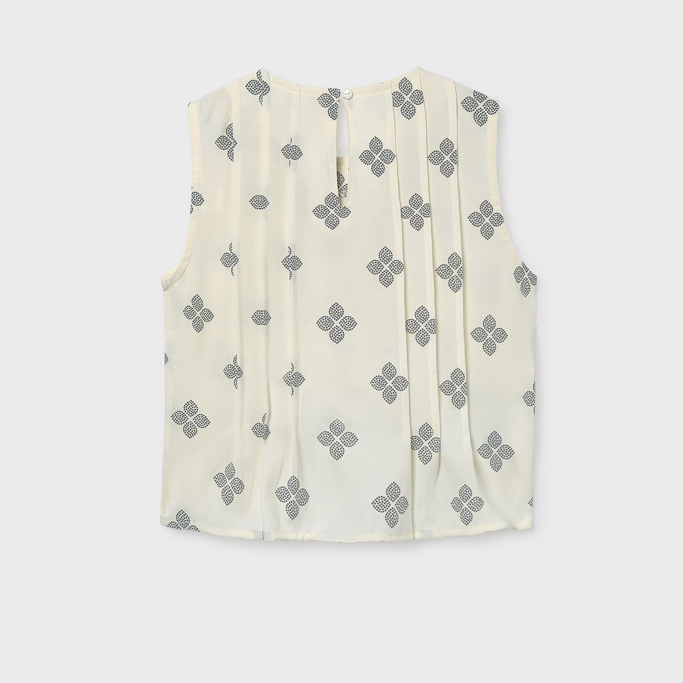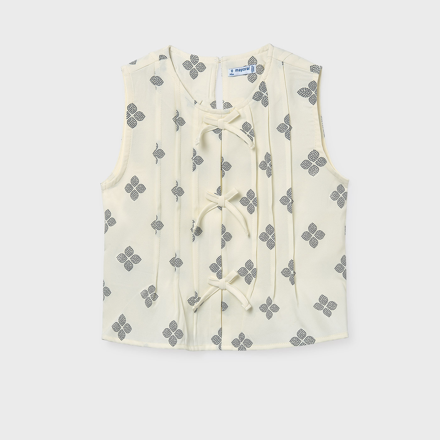 Το παιδικό σταμπωτό τοπ Mayoral σε υπέροχη μπεζ απόχρωση είναι μια κομψή και δροσερή επιλογή για τις καλοκαιρινές εμφανίσεις των κοριτσιών. Κατασκευασμένο από ελαφρύ, αέρινο ύφασμα, προσφέρει άνεση και ευχάριστη αίσθηση ακόμα και τις πιο ζεστές ημέρες.Ξεχωρίζει για το διακριτικό all-over μοτίβο με μικρά λουλουδάκια, που χαρίζει ρομαντικό χαρακτήρα, καθώς και για τα κομψά διακοσμητικά φιόγκια στο μπροστινό μέρος, τα οποία προσθέτουν μια ιδιαίτερη, girly πινελιά. Η αμάνικη γραμμή και η ίσια εφαρμογή το καθιστούν πρακτικό και ευκολοφόρετο, ιδανικό τόσο για καθημερινές εμφανίσεις όσο και για πιο προσεγμένες εξόδους.Συνδυάζεται άψογα με σορτς, φούστες ή παντελόνια, δημιουργώντας καλοκαιρινά σύνολα για βόλτες, διακοπές ή οικογενειακές εκδηλώσεις.