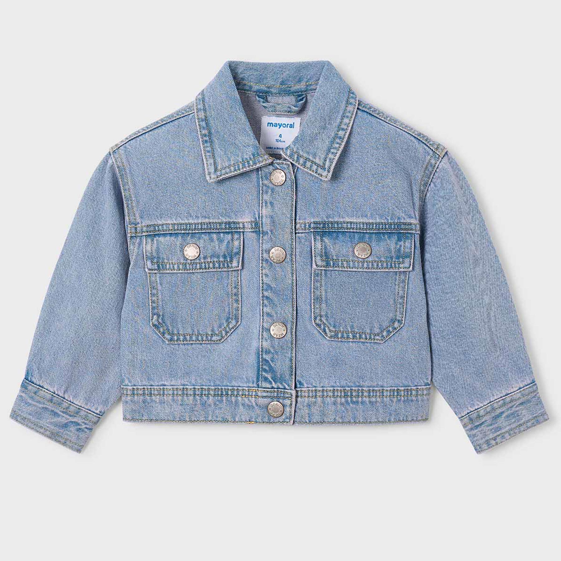 Ανανεώστε την παιδική γκαρνταρόμπα με αυτό το παιδικό denim τζάκετ Mayoral σε ανοιχτό μπλε, ένα διαχρονικό κομμάτι που συνδυάζει άνεση, ποιότητα και μοντέρνο στυλ. Ιδανικό για καθημερινές εμφανίσεις, σχολείο ή βόλτες, φοριέται εύκολα πάνω από φορέματα, μπλούζες και σετ, προσθέτοντας casual χαρακτήρα σε κάθε outfit.Κατασκευασμένο από ανθεκτικό και απαλό τζιν ύφασμα, προσφέρει άνετη εφαρμογή και ελευθερία κινήσεων. Διαθέτει κουμπιά μπροστά, κλασικό γιακά, δύο πρακτικές τσέπες στο στήθος και προσεγμένες ραφές, στοιχεία που εξασφαλίζουν μακροχρόνια χρήση και σταθερή εφαρμογή. Το ανοιχτό μπλε denim χρώμα το καθιστά ευκολοσυνδύαστο και ιδανικό για όλες τις εποχές.